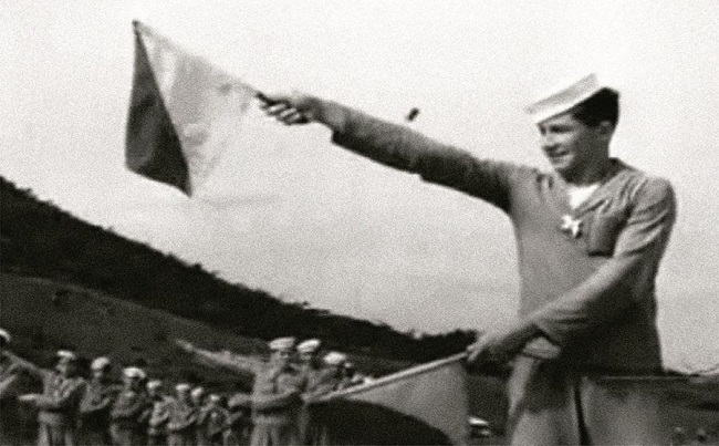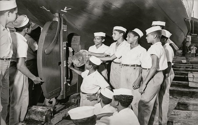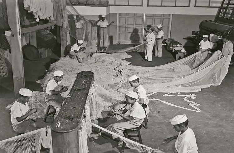 O documentário Marambaia, produzido pelo Instituto Nacional de Cinema Educativo (Ince) 7 em 1945, com direção de Humberto Mauro, é outra fonte de informação sobre as atividades diárias realizadas pelos menores na EPDV. As imagens, acompanhadas de uma narrativa em off, apresentam os alunos realizando exercícios de remo em escaler e da disciplina semáfora – correspondente à comunicação por meio de sinais com bandeirolas ( Figura 7) –, assim como trabalhando na secagem e reparação das redes de pesca, prática que também foi captada pelas lentes de um fotógrafo da Agência Nacional 8 ( Figuras 8 e 9). Sobre esta última atividade, o narrador faz uma curiosa revelação: “Não obstante a existência de máquinas para o fabrico de redes, os alunos são obrigados a confeccioná-las manualmente recebendo remuneração por tarefa”. Essa exigência é justificada por Rodolpho Fuchs em matéria para o jornal A Manhã, em que menciona, devido ao fato de o país ainda não ter “um completo desenvolvimento da sua indústria mecanizada”, ser necessária a adoção de dois planos de ensino na escola – um “rudimentar, usando o menos possível o maquinário e complicações da mecanização” e o outro com o “uso eficiente de maquinário, aparelhos, filtros etc.” –, porque numa situação de falta de maquinário os alunos saberiam substituí-lo por sua habilidade e técnica ( Desenvolvendo..., 30 out. 1942, p.10). Quanto à remuneração concedida por tarefa aos menores, era uma prática adotada não apenas naquela unidade do ACR, mas em todas as demais, como no Instituto Profissional Getúlio Vargas (IPGV), conforme mencionou o doutor Hélion Póvoa num dos relatórios oficiais da entidade: “O Instituto gratifica aqueles que, aprendendo, já produzem ... jamais explorando o trabalho de quem quer que seja” ( ACR, 1938-1945, relatório 1942, p.23).