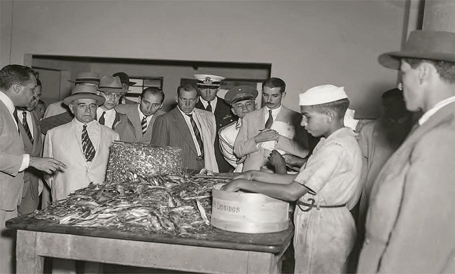 O documentário do Ince aborda também o modo como era estruturado o ensino na EPDV. Os alunos da primeira série aprendiam e praticavam a pesca denominada arrastão. Depois, eram iniciados na pesca de caniço ou de linha e, posteriormente, na de caráter industrial, feita em embarcações motorizadas, que propiciavam a pesca da sardinha, peixes de fundo e, sobretudo, do cação e do boto. A equipe envolvida com este último tipo de pesca era composta por pescadores experientes, instrutores e pela turma de aprendizes ( Caminha, 2012, p.88). Nas fábricas, os alunos eram envolvidos em todas as etapas de preparação da sardinha em conserva, desde a limpeza do peixe até seu ajuste nas latas ( Figuras 10 e 11).