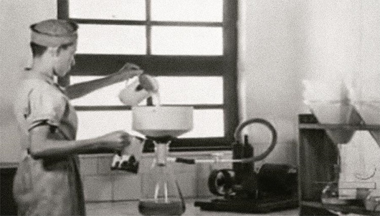 Como na ilha da Marambaia o cação era abundante, chegando à produção de aproximadamente 12 mil quilos ao mês, o doutor Humberto Cardoso, assistente técnico do Instituto Oswaldo Cruz (IOC), instalou ali um laboratório para realização de pesquisas sobre a natureza e a riqueza do óleo de fígado de cação, sobretudo em relação a sua concentração de vitamina D. A expectativa do doutor Cardoso era que o óleo de fígado de cação substituísse o óleo de fígado de bacalhau num momento de escassez desse produto no mercado interno devido ao contexto de guerra internacional ( Cardoso, 1946, p.1, 2). O pesquisador defendia a retirada dos fígados do peixe o mais cedo possível, logo após a chegada do material à terra, porque havia um sensível declínio da riqueza vitamínica do animal após sua morte. Dessa forma, segundo ele, ocorria a preservação da vitamina A e se garantia a qualidade do próprio óleo. Os alunos da Escola de Pesca participavam de todo o processo de preparação industrial do óleo de fígado de cação, da pesca e limpeza do peixe às atividades laboratoriais ( Figuras 12 e 13).