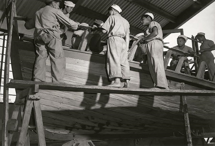 Havia também na EPDV, além dos departamentos Industrial e Marítimo – este último responsável pelo escoamento da produção da escola –, 9 uma seção de Construção Naval, onde os alunos aprendiam a construir barcos e fazer peças para diversas embarcações ( Desenvolvendo..., 30 out. 1942, p.10). Somente em 1944 foram construídos ali cinco baleeiras, três canoas de pesca, uma canoa a motor, duas lanchas e uma catraia ( ACR, 1938-1945, relatório 1944, p.34). Os alunos também se dedicavam ao reparo de toda a frota de pesca nos estaleiros da escola, que em 1944 totalizava dez embarcações: as traineiras Presidente Vargas e Ministro Capanema, que faziam o serviço de transporte entre a ilha e o Rio de Janeiro; as traineiras Almirante Guilhem, Hildebrando Góes, D. Santa e Amaral Peixoto; o barco Romero Estelita; as caçoeiras Carneiro de Mendonça, São Francisco de Assis e a lancha Alzirinha (Os estaleiros..., 7 jan. 1944, p.9) ( Figuras 14 e 15).