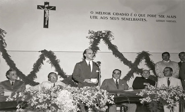 No auditório, onde se realizava a formatura, atrás da mesa onde sentavam as autoridades, observava-se na parede, além do crucifixo, duas frases atribuídas a Getúlio Vargas: “O melhor cidadão é o que pode ser mais útil aos seus semelhantes” e “O trabalho é o maior fator da elevação da dignidade humana”. As frases transmitiam uma mensagem a todos os presentes: o trabalho era o meio pelo qual o indivíduo se transformava em um cidadão útil aos seus semelhantes e à pátria. Essa era a ideologia propagada pelo Estado Novo, de valorização do trabalho e dos trabalhadores, que era a “expressão viva e máxima de nossas possibilidades de desenvolvimento socioeconômico” para o estabelecimento de uma nação próspera e harmoniosa ( Gomes, 1982, p.122) ( Figuras 16, 17 e 18). 10