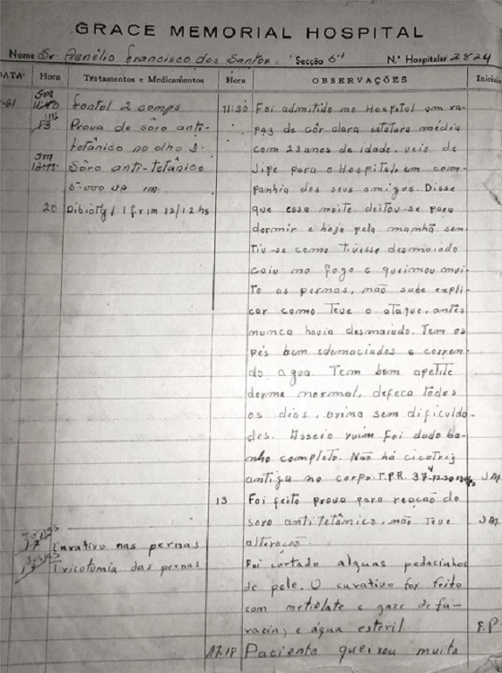 Os prontuários médicos são fontes importantes para acompanhar o processo de internamento e evolução dos pacientes. Aqueles que eram admitidos no Grace Memorial Hospital tinham seus registros efetuados em detalhes pelo médico e por enfermeiras. Cada prontuário, além de possuir um número específico e informar o nome completo do paciente, tinha espaços para a anotação da data, da hora, do tratamento e dos medicamentos ministrados. Além desses campos, havia o direcionado às observações gerais e o que deveria ser preenchido com as iniciais dos profissionais que faziam o atendimento. Esses dados eram atualizados algumas vezes ao dia, à medida que fossem realizados os procedimentos. As informações mais detalhadas ficavam registradas nas observações. Nelas eram descritas as condições de admissão dos doentes, sua cor, idade, estatura, além da forma como chegaram ao hospital e o motivo da internação. É possível observar ainda, em alguns prontuários, comentários sobre o estado emocional dos doentes e suas reações aos tratamentos sugeridos. Os prontuários, após serem colocados em envelopes individuais, com a numeração específica e o nome do doente, eram arquivados.