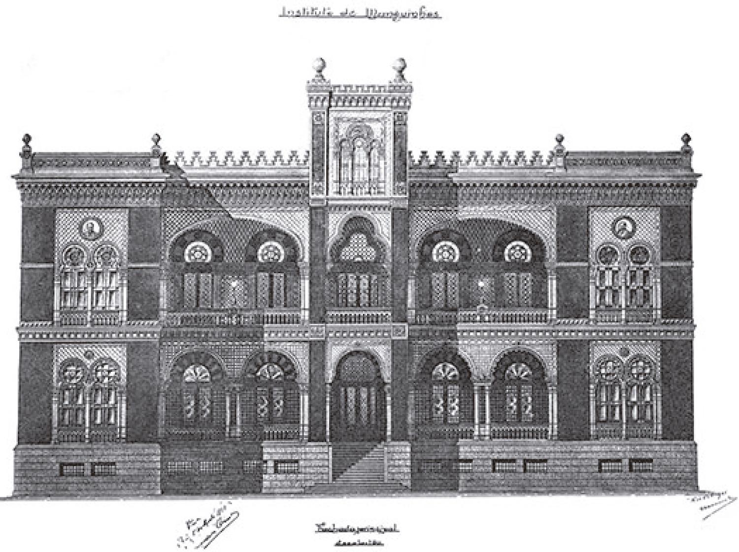 Segundo o museólogo Luiz Fernando Ribeiro, na justificativa de tombamento do Conjunto Arquitetural de Manguinhos, o primeiro esboço, feito pelo próprio cientista, imaginou uma “construção de corpo horizontal, com dois bastiões laterais, um central, dezessete janelas e uma grande porta com escada de acesso ao segundo andar. Apresentada a ideia ao arquiteto, este executa um trabalho semelhante ao de Oswaldo Cruz, sem as torres laterais, mas já em estilo mourisco” (Ribeiro, 1980, p.B). Essa configuração ( Figura 1), sem as torres, tem grande semelhança com o Observatório de Montsouris ( Figura 2). O observatório parisiense teria sido visitado algumas vezes por Oswaldo Cruz, durante sua estada no Instituto Pasteur (1898-1899), o que o qualifica como a primeira grande inspiração ao projeto de Moraes Jr.