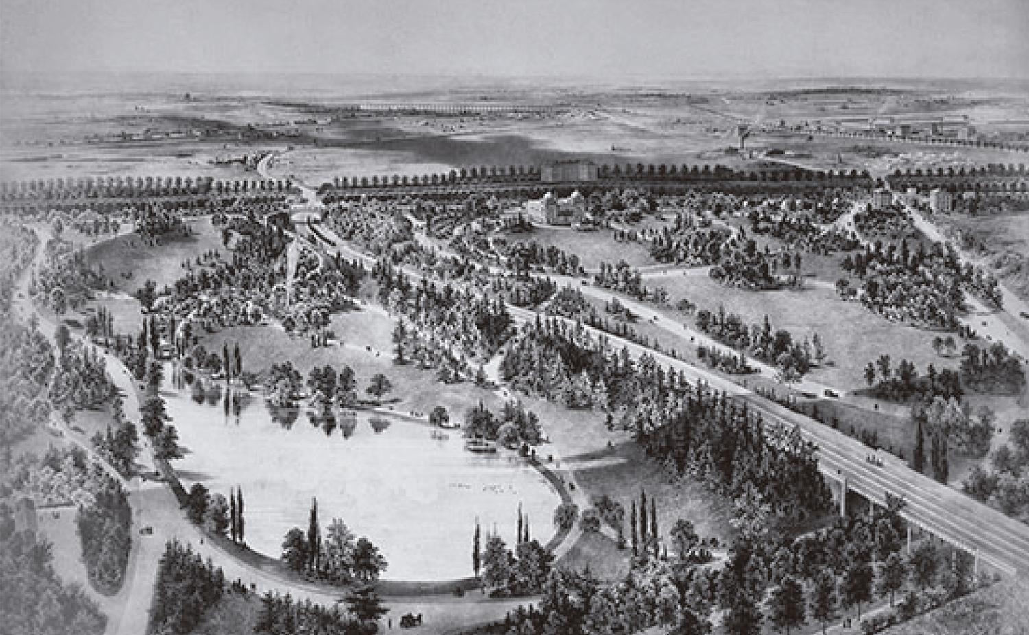 O palacete foi implantado em cima de uma colina do parque urbano de Montsouris, cercado por um extenso relvado. Pelas fotografias e gravuras (cartões-postais) pesquisadas, essa posição estratégica conferia imponência à edificação. O Parc Montsouris foi situado na periferia urbana da cidade de Paris, com traçado romântico, usual na época. A implantação desse parque foi uma das iniciativas de embelezamento urbano da administração de Haussmann, sob a régia de Luís Napoleão (Napoleão III), anteriormente comentadas. Oswaldo Cruz, durante sua estada em Paris com sua família, registrou algumas imagens de seus passeios aos parques da cidade. Os parques públicos, criados no século XIX, eram uma alternativa de lazer típica da época e configuravam-se como locais contemplativos, salubres e símbolos de status social. Levantamos a hipótese de que a implantação do Palais du Bardo, em relação ao Parc Montsouris ( Figura 3), adequar-se-ia muito bem à intenção de posicionar o edifício-sede de sua própria instituição no terreno de Manguinhos, situado às margens da baía de Guanabara.