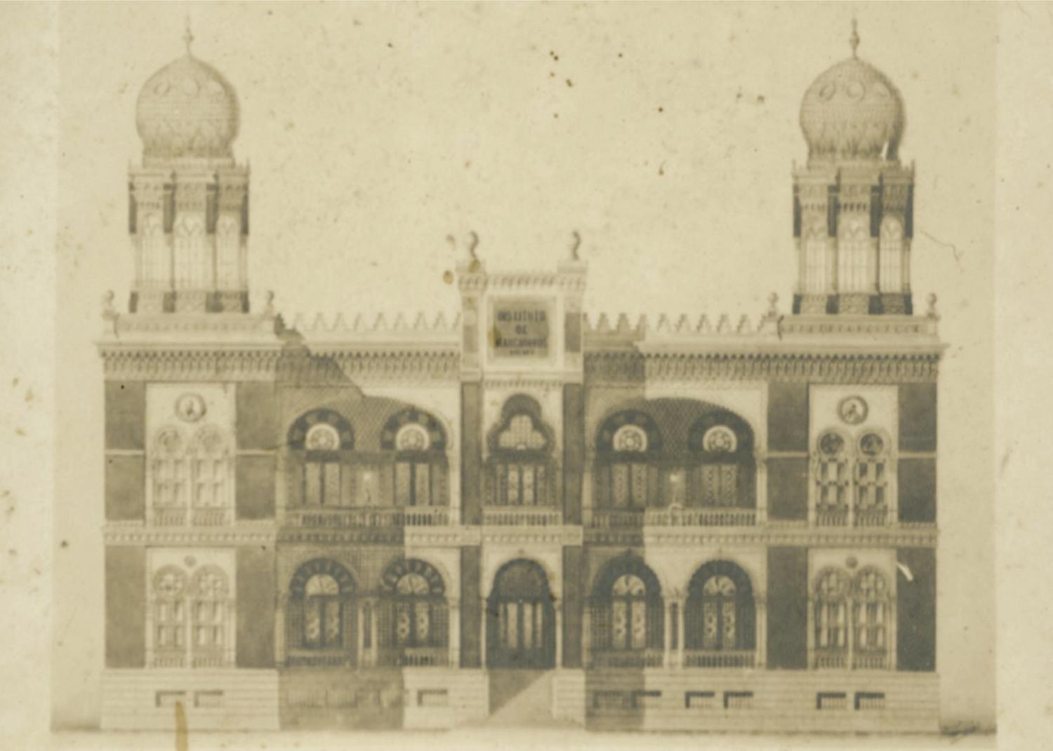 Retomando o trabalho do museólogo Luiz Fernando, que examina as influências e o processo criativo da composição do Pavilhão Mourisco, “segue-se a esse projeto, um outro, no qual foram inseridas as duas torres”, conforme observamos no postal encontrado no Fundo Luiz de Moraes Jr. e, até então, inédito ( Figura 4). “O definitivo difere dos anteriores por possuir cinco andares, que conferem ao prédio não só mais espaço útil como, também, maior grandiosidade”, conclui o museólogo ( Ribeiro, 1980, p.B). Nesse caso ( Figura 5), a configuração final do projeto, de 1908, com cinco pavimentos, teria sido apresentada após viagens do cientista e do arquiteto à Alemanha, quando tiveram contato com a Nova Sinagoga de Berlim.