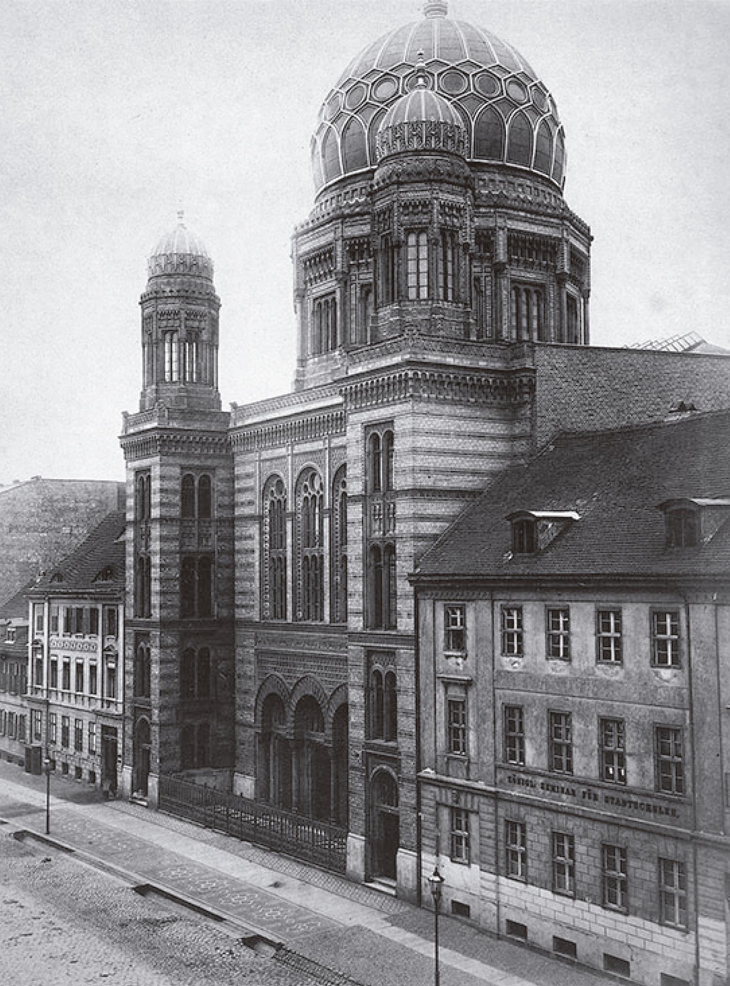 A referência à Sinagoga de Berlim deu a configuração final ao projeto do Castelo Mourisco da Fiocruz como o conhecemos até hoje, ao menos em sua fachada principal. A sinagoga está alinhada a outros edifícios situados ao seu redor, diferente do Castelo Mourisco da Fiocruz, posicionado em meio de terreno, com as quatro fachadas visíveis, semelhante implantação do Palácio de Montsouris em seu parque. Portanto, apenas a fachada anterior da sinagoga se apresenta à cidade. Pela análise dessa fachada, vemos o quanto sua imponência acabou por influenciar o projeto final para Manguinhos. A sinagoga apresenta um pavimento térreo e três pavimentos superiores, além de elementos visuais, como arcos, cornijas e platibandas ao longo de todo o pano da fachada. Na horizontalidade, essa se divide em três subplanos, o central e os dois laterais. No ápice dos planos laterais se localizam as torres octogonais. Todos esses detalhes e opções de estilo podem ser vistos no palácio do Rio de Janeiro. As semelhanças são, de fato, incríveis para ser descartadas como mera coincidência ( Figura 7).