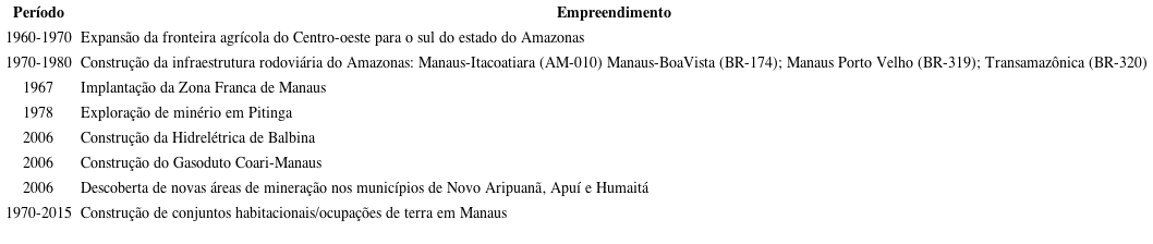 Estudos sobre essa dinâmica, a partir de então, demonstraram que ela está diretamente ligada às mudanças provocadas pelos projetos de desenvolvimento regional. O Quadro 1 mostra grandes projetos que interferiram nos processos de urbanização, industrialização e na epidemiologia da LTA no Amazonas.
