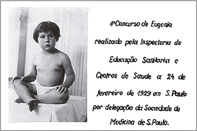 Portanto, a educação feminina tornou-se um ponto prioritário para a medicina, uma que, por meio dela, pretendia-se o aprimoramento físico e moral das mulheres como mães e das futuras gerações do país. As “novas mulheres” eram definidas como agentes familiares da higiene social e deveriam tornar-se o porto seguro da moral da sociedade. Exemplificando o ideal dessas “novas mulheres” submetidas à tutela médica, segundo as atas do primeiro Congresso Brasileiro de Eugenia, organizou-se no Brasil, em 1926, o primeiro Concurso de Eugenia. Organizado por dois engenheiros eugenistas, o concurso, cuja submissão de inscrição foi de caráter popular, almejou premiar crianças brasileiras que mais se aproximassem do tipo eugênico ideal. Apoiado por Moura Campos, presidente da Sociedade de Medicina e Cirurgia, que pretendia homenagear o centenário da morte da imperatriz Leopoldina, o concurso submeteu crianças a exames de seleção para sua classificação eugênica (Atas..., 1929, p.57). Em seu trabalho, a médica Maria Antonieta de Castro também descreve concursos para selecionar a melhor robustez infantil, inclusive escolhendo um “Bebê eugênico”, que tinha como objetivo eleger as crianças a partir do critério de serem eugenicamente saudáveis (Figura 1) (Souza, 2009, p.770).