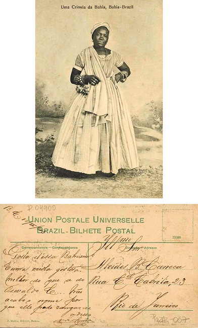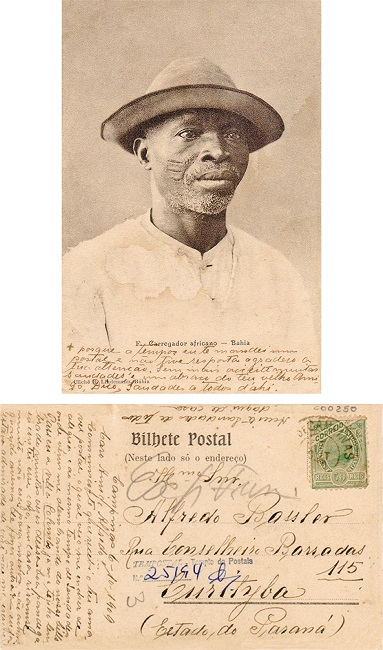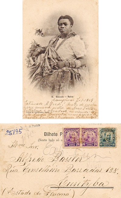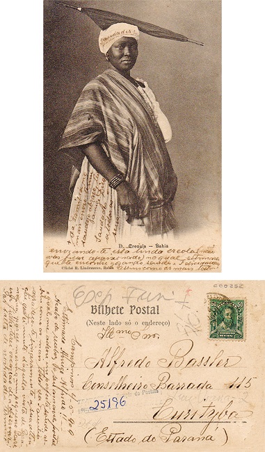 Um pequeno número de quatro cartões-postais é familiar à pesquisa histórica no Brasil. Foram abordados entre 1979 e 2014 por especialistas experientes e duas mestres em história (pelo menos). Três são postais de baianas, designadas “crioulas”, sendo dois remetidos no mesmo ano de 1909 e o terceiro em 1913. Também em 1909 foi despachado o “ganhador africano”, que – menos examinado – é o quarto e último elemento deste reduzido conjunto. Os três enviados em 1909 obedecem a uma série produzida e vendida pelo retratista e editor Lindemann, com as letras D. e K. correspondendo a mulheres e F. a um homem. Mandado imprimir por J. Mello, o exemplar de 1913 é um avulso, ou seja, não pertence a uma série. Os editores Lindemann e Mello atuaram em Salvador entre o fim do século XIX e o início do XX, mas isso não impediu as correspondências de circularem, em 1909, entre Campinas e Curitiba. Com lugar de origem ininteligível, o de 1913 foi entregue no Rio de Janeiro.