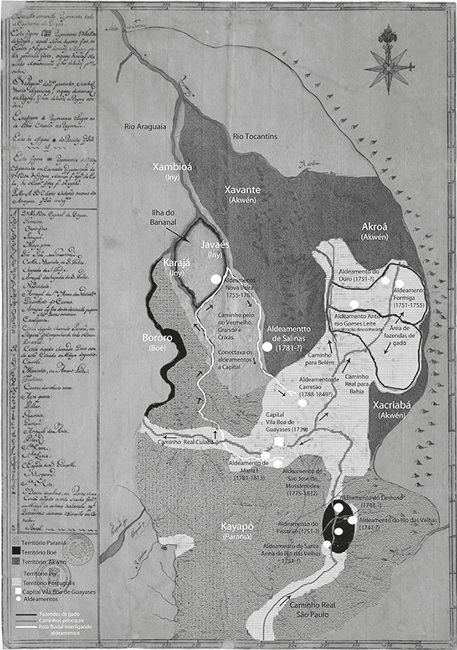 Houve três momentos na política de aldeamentos. O primeiro entre 1731-1751, quando ocorreu a fundação de quatro aldeamentos formados por Bororo para combater os Kayapó ao sul e três ao norte para aldear os Akroâ e os Xacriabá. Os aldeamentos tinham também a função de proteger os caminhos principais, como o que ligava a capitania de São Paulo à capital da capitania de Guayases, ou o que conectava a capital na direção oeste a Cuiabá, ou ainda um terceiro caminho que seguia na direção norte rumo a Bahia e Belém do Pará. No mapa é possível identificar, ainda, duas áreas de criação de gado na direção nordeste, ocupadas inicialmente nesse período por fazendeiros de gado provavelmente originários da região do rio São Francisco.