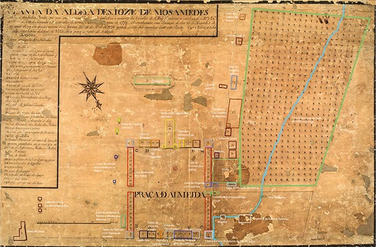 O aldeamento de São José de Mossâmedes foi suporte à expansão colonial, pois fornecia suprimentos e mão de obra e se interligava por via fluvial a outros quatro aldeamentos pombalinos; localizava-se a poucas léguas da Vila Boa de Guayases (Figura 2). A partir dele era possível chegar ao rio Araguaia e então até o Tocantins, com destino a Belém do Pará. Batizado em honra a seu idealizador, Mossâmedes, foi concebido para assimilar os indígenas a partir do trabalho. No primeiro ano do aldeamento, ele afirmou “parecer indispensável na vizinhança desta Vila, fazer um estabelecimento que sirva de modelo a todos, e lhes incitasse a indústria, sendo ao mesmo tempo Seminário dos Artífices” (Carvalho, 20 set. 1776). Em outro ofício ao secretário de Estado Martinho de Melo e Castro, esclarece que o objetivo era criar “um estabelecimento regular, e permanente, que invejassem todos os índios silvestres, que de visita saíssem a povoado, servindo como de universidade aos que quisessem aldear-se” (Carvalho, 2 jan. 1779).