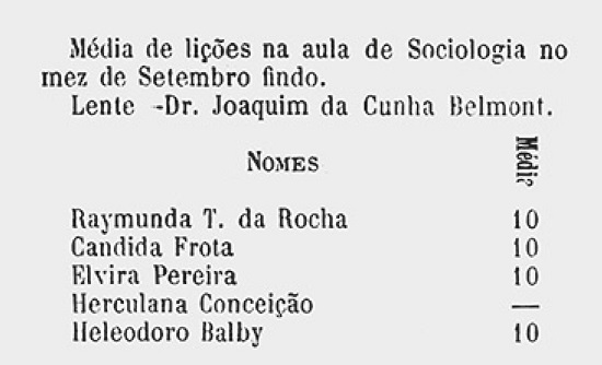 Em novembro do ano seguinte, quatro alunos se submeteram ao exame final de “sociologia e moral” da Escola Normal: dois homens e duas mulheres (Diário Oficial..., 21 nov. 1895). Todos os alunos foram aprovados com nota 8, em uma escala de 0 a 10 (Diário Oficial..., 23 nov. 1895).