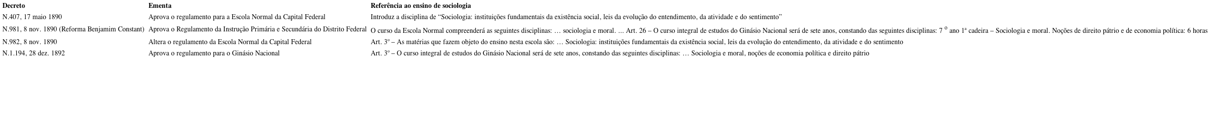Notamos que a sociologia não foi introduzida como disciplina específica no ensino secundário. No curso de formação de professores primários ela foi intitulada “sociologia e moral”, e nas três experiências conhecidas do ensino ginasial (Manaus, Sergipe e Paraná), “sociologia, moral, noções de economia política e direito pátrio”, o que parece ter ocorrido por indicação de decretos federais publicados entre 1890 e 1892.