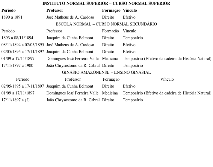 Como as cadeiras da Escola Normal foram organizadas a partir daquelas existentes no Instituto Normal Superior, os docentes deste assumiram as mesmas disciplinas nos cursos normal e ginasial. Contudo, o professor de “sociologia e moral” José Matheus de Aguiar Cardoso, que havia assumido o cargo em janeiro de 1890, optou por deixar o Amazonas em 1891, indo para o Rio de Janeiro, onde atuou como redator do jornal Diário do Comércio, chegando a ser redator de debates da Câmara dos Deputados. Por interrupção das atividades do jornal, no mesmo ano, dirigiu-se para Cabo Frio (RJ) e Barra Mansa (RJ), onde atuou até 1894 como promotor público desses municípios ( Guaraná, 1925).