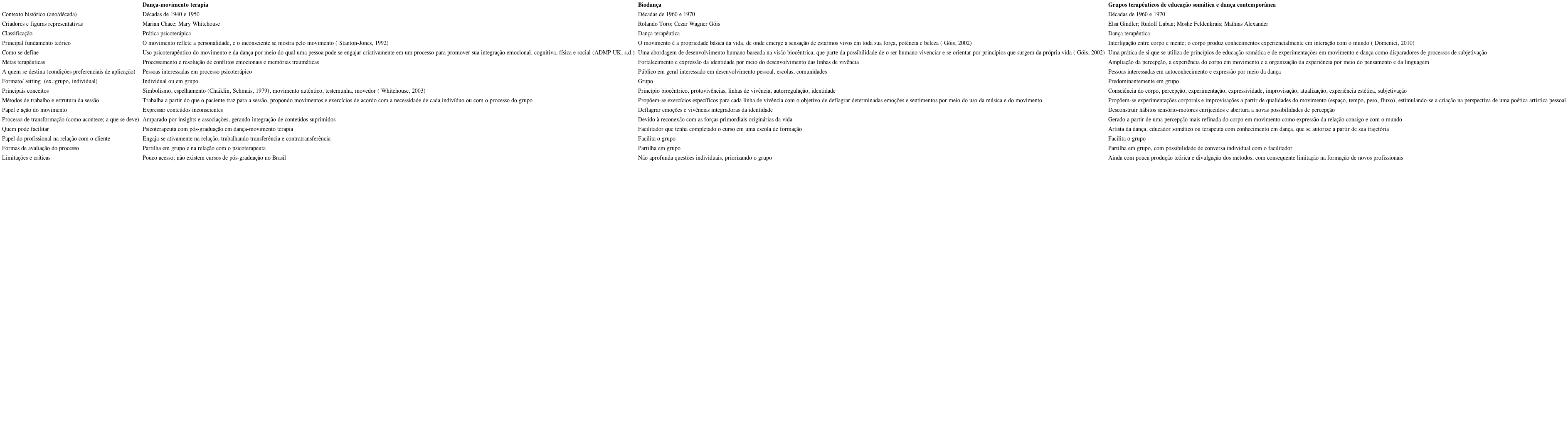 Por tratar-se de um campo bastante diversificado, torna-se difícil abordá-lo como um bloco homogêneo. Entretanto, considerando a experiência brasileira, observa-se nas últimas décadas o surgimento de algumas práticas nas quais se identificam alguns princípios em comum, embora resultantes de percursos distintos. Como exemplos dessas experiências, podemos citar a aplicação terapêutica do método Angel Vianna ( Resende, 2008), o trabalho de dança e terapia ocupacional desenvolvido por Liberman (2008) e o trabalho na interface entre dança contemporânea, educação somática e Gestalt-terapia desenvolvido por Severo Junior (2008, 2013).