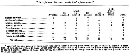 El estudio muestra que la clorpromazina no fue utilizada exclusivamente para casos de esquizofrenia, como ocurrirá posteriormente. Su función terapéutica principal parecía reducirse a controlar la agitación y la ansiedad, provocando sedación. La droga no parece ser eficaz para la depresión, siendo eficaz para casos de agitación motora y manía. “Los neurolépticos son efectivos contra la manía y, raramente, pueden inducir cierto grado de depresión (como la reserpina)” ( Deniker, 1990 , p.86).