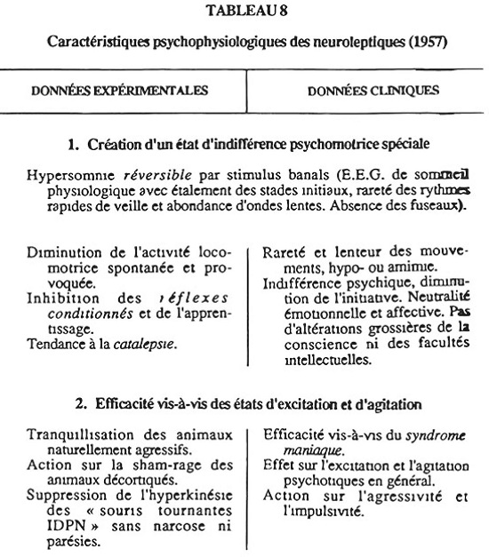 La descripción que Delay y Deniker (1952b) hicieron de los pacientes tratados, destacando la aparente indiferencia o demora en responder a estímulos externos, la neutralidad emocional y afectiva, la disminución de la iniciativa será retomada por Deniker en un texto de 1987. Allí, refiriéndose a las investigaciones realizadas en 1957, compara los datos experimentales obtenidos en laboratorio, realizados con ratas, con los relatos clínicos de los pacientes. Resume esos datos en la tabla presentada en la Figura 2 , donde sintetiza las características psicofisiológicas de los neurolépticos.