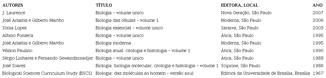 Para o entendimento de como a concepção histórica acerca do conceito de enzimas é apresentada em materiais didáticos, foi realizada uma análise documental ( Pimentel, 2001 ) em nove livros utilizados no ensino médio ( Quadro 2 ). Tais obras são do Programa Nacional do Livro Didático. Além disso, a escolha também levou em consideração a ampla circulação de alguns títulos (como Amabis, Martho, 2006; Jotta, Carneiro, 2009), que possivelmente contribuem para a introdução do conceito de enzima numa parcela significativa dos estudantes, bem como a amplitude temporal de publicação das obras (1967-2007), que permitiu entender como a temática vem sendo apresentada nos livros ao longo do tempo. A versão azul do BSCS ( Biological Sciences Curriculum Study ) foi escolhida porque enfatiza os conteúdos no nível molecular e bioquímico ( Lorenz, 2008 ).