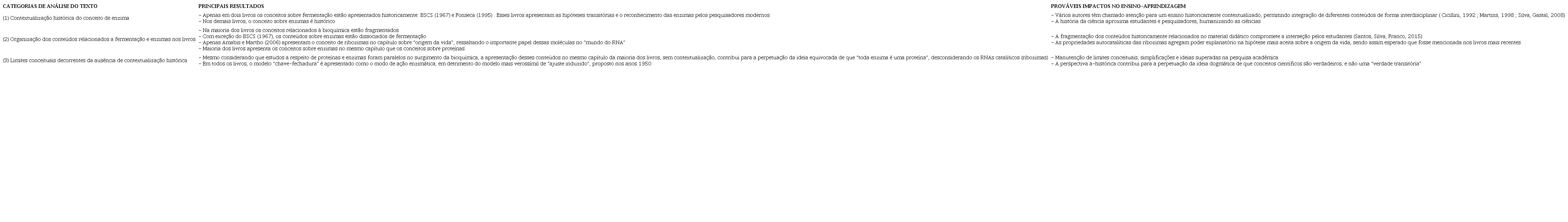 A análise do material didático está apresentada em parâmetros predefinidos para caracterizar parâmetros históricos da produção do conhecimento científico sobre as enzimas, a saber: (1) se é feita a contextualização histórica das enzimas; (2) como os conteúdos de bioquímica relacionados ao tema estão organizados; (3) se existem limites conceituais decorrentes da falta de contextualização histórica.
