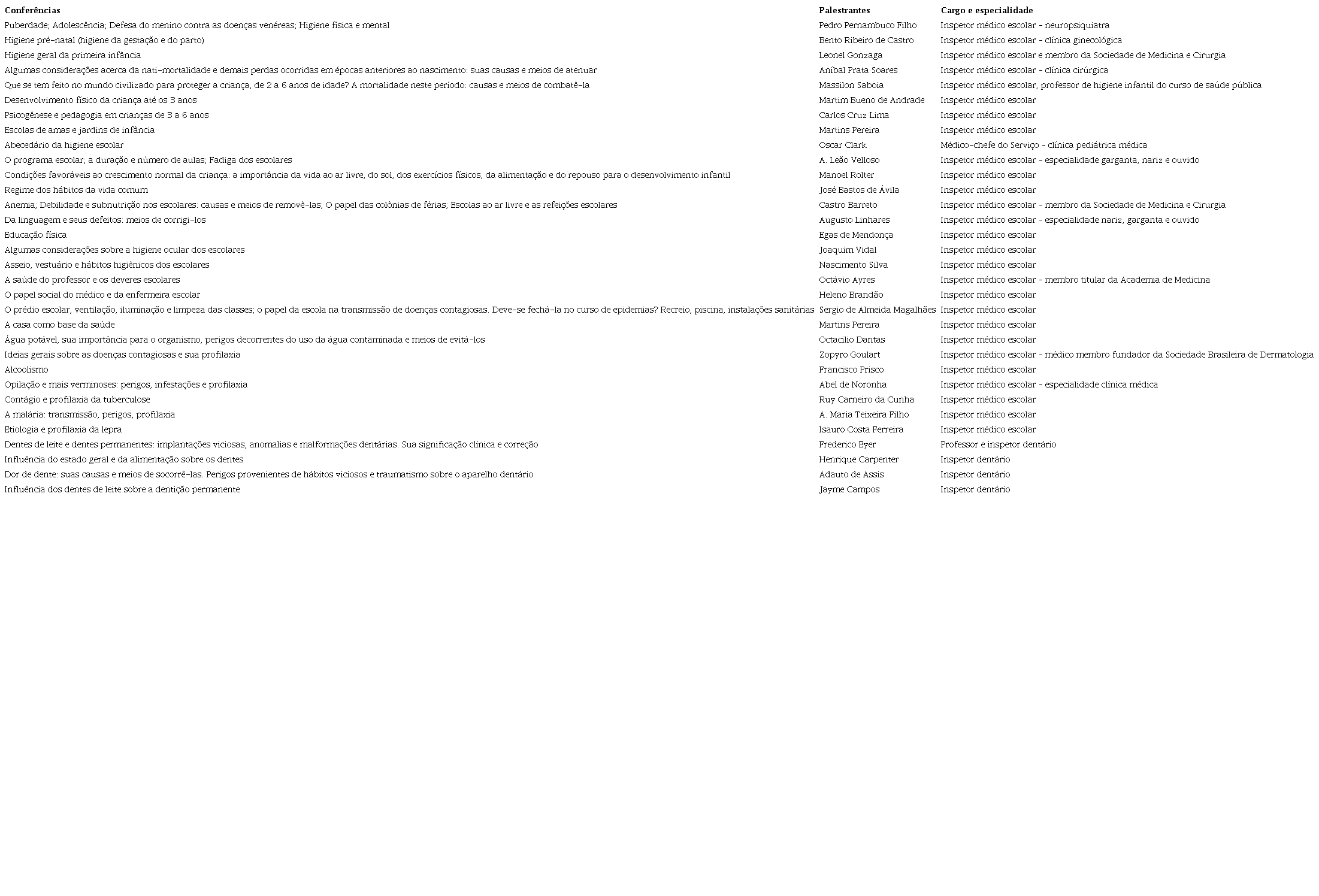Nessa direção, o curso foi concebido em três grandes eixos: “a escola” – seus programas, a higiene escolar, a linguagem, o médico, a enfermeira, a professora, o prédio, os hábitos higiênicos e de saúde, a fadiga escolar; “a criança/escolar” – os dentes, os vermes, a puberdade, a higiene geral da primeira infância; e “a casa/doenças” – a casa como base da saúde, o alcoolismo, a malária, a tuberculose e a alimentação. Esses eixos se desdobraram nas 33 preleções, estruturando-se em três partes: higiene da gravidez; higiene da primeira infância e higiene escolar. Respaldado no papel educativo com o qual a medicina preventiva articulada à higiene escolar seria capaz de assegurar a defesa orgânica e social da criança, o curso foi pensado em seu caráter pedagógico, cultural e político. Para isso, contemplou temáticas variadas e úteis à vida prática, com notável recorrência para o desenvolvimento biológico nas diferentes fases da infância e da adolescência. Temas referentes a mortalidade infantil, doenças venéreas, alcoolismo, puberdade, higiene infantil, doenças contagiosas, higiene escolar, merenda, prédio escolar, entre outros, assumiram destaque, como pode ser observado no Quadro 1 .8