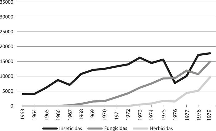 O consumo aparente de agrotóxicos no Brasil (calculado a partir da soma da importação e da produção interna) apresentou grande aumento na década que antecedeu o PNDA: saltou de aproximadamente 16 mil toneladas anuais, em 1964, para mais de 100 mil toneladas em 1974 ( Alves, maio-jun. 1973, p.10; Brasil, jul.-dez. 1975, p.55) ( Figuras 1 e 2). Esse aumento teve relação direta com políticas implementadas pelo governo brasileiro vinculadas à isenção tributária e ao estímulo creditício ( Pelaez et al., 2015, p.159). Os agrotóxicos estavam isentos de cobrança do Imposto de Circulação de Mercadorias, desde 1969, e do Imposto sobre Produtos Industrializados, desde 1959 ( Brasil, jul.-dez. 1975, p.56). O Sistema Nacional de Crédito Rural (1965) passou a condicionar a concessão de crédito aos agricultores à destinação obrigatória de um percentual (15% do crédito de custeio) para a compra de insumos agrícolas. Estimativas apontam que, do total de vendas de agrotóxicos em 1976 (Cr$4,1 bilhões), 85% havia sido financiado pelo crédito rural ( Bull, Hathaway, 1986, p.156).