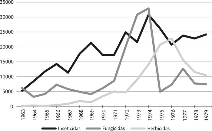 A produção de fungicidas apresentava um incremento significativo desde 1967, quando as primeiras indústrias passaram a produzir essa categoria de agrotóxicos no país. Empresas como Du Pont, Rohm & Haas, Rhodia e Sandoz atuavam no país antes da execução do PNDA ( Quadro 1). A produção, entretanto, era bem menor do que o consumo estimulado pelo modelo agroindustrial: as importações de fungicidas aumentaram mais de três vezes entre 1962 e 1973. Em 1972, a expansão da doença fúngica chamada “ferrugem do cafeeiro” fez o consumo de oxicloreto de cobre disparar. Apesar de esse fungicida já ser produzido no país pela Sandoz e pela nacional Adolfomer, o mercado interno foi abastecido com importações ( Figura 1), com destaque para o aumento da importação de fungicidas no período entre 1971-1974.