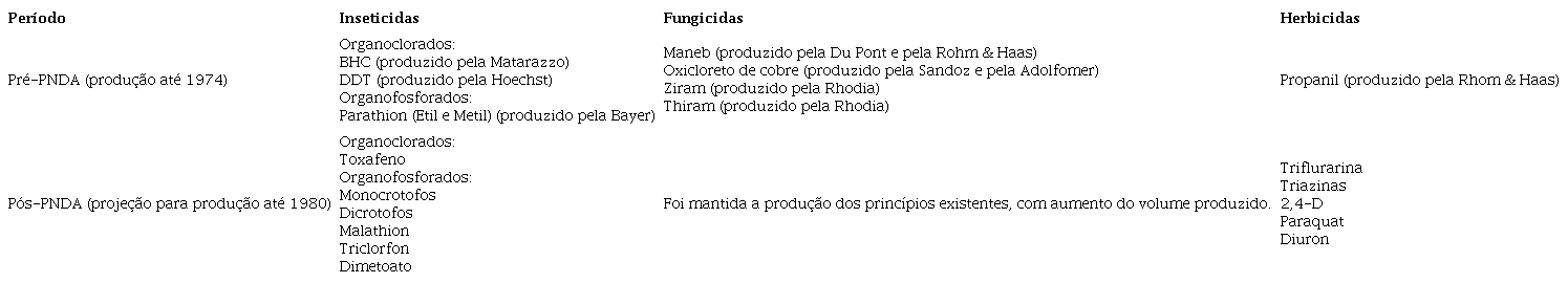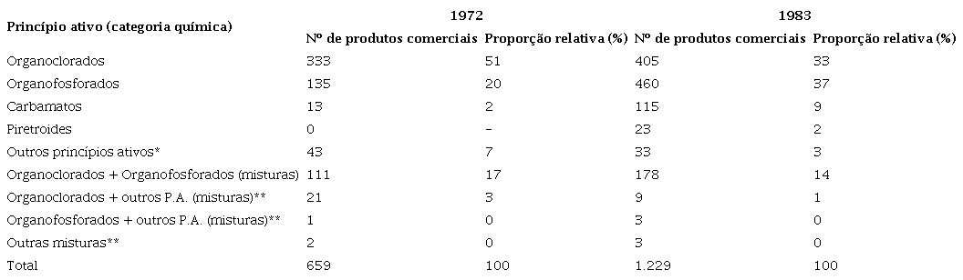 Sustentamos neste artigo que o PNDA representou também uma transição no perfil do uso de agrotóxicos na agricultura nacional, afirmação que pode ser corroborada pela comparação dos produtos comerciais liberados para utilização antes e depois da execução do programa ( Tabela 2). Em 1972, de 659 produtos comerciais registrados para uso como inseticidas e acaricidas, 71% envolviam a utilização de algum organoclorado em sua composição, montante que caiu para 48% em 1983.