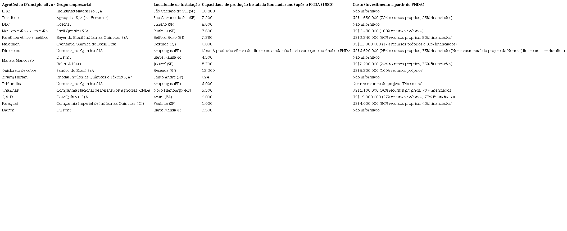 Conforme já mencionado, o objetivo geral do PNDA era aumentar a produção interna de pesticidas e diminuir a necessidade de importações. As chamadas “metas físicas” do PNDA pretendiam ampliar a produção dos pesticidas que já eram produzidos e iniciar a produção do inseticida organoclorado toxafeno; dos inseticidas organofosforados monocrotofos, dicrotofos, malathion, triclorfon, dimetoato; e dos herbicidas triflurarina, triazinas, 2,4-D, paraquat e diuron ( Quadro 1). A proposta inicial do plano previa a destinação de Cr$1.309 milhões (sem detalhar a aplicação exata dos recursos) a serem utilizados nos “investimentos necessários (projetos, construções, equipamentos, supervisão etc.) para a implantação e expansão da indústria nacional de defensivos, objetivando atingir as metas de produção anteriormente citadas” ( Brasil, jul.-dez. 1975, p.73-74).