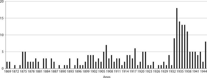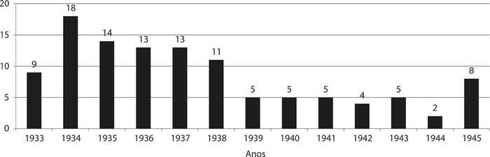 O discurso informativo regressa depois de 1918, mas a subida ao poder dos nazistas traz uma importante alteração quantitativa no número de notícias sobre a Alemanha publicadas pela Nature. Um olhar mais detalhado permite perceber que a larga maioria dos textos é publicada no período que antecede o início da Segunda Guerra Mundial ( Figura 2), mas o que aqui importa verdadeiramente sublinhar é que a essa alteração quantitativa corresponde também uma profunda alteração qualitativa e temática dos textos.