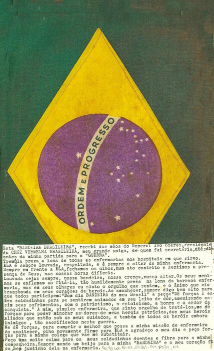 A bandeira do Brasil que ficou exposta nos locais em que a enfermeira Virgínia Portocarrero serviu foi inspiração para o enfrentamento do trabalho de assistência cotidiana aos soldados feridos no front . A enfermeira fez da bandeira brasileira um emblema para promover positividade no enfrentamento dos momentos difíceis, ao tempo em que essa representação endossava o discurso patriótico.