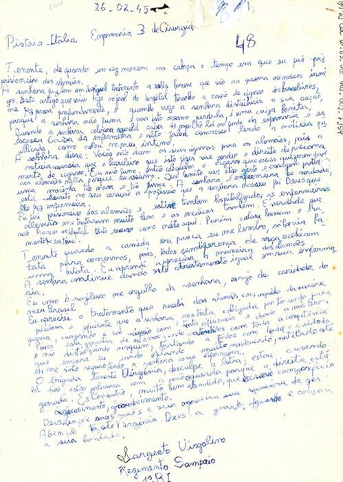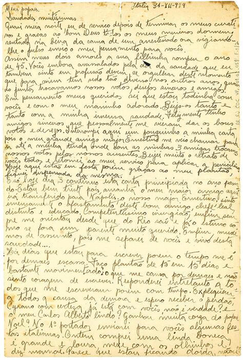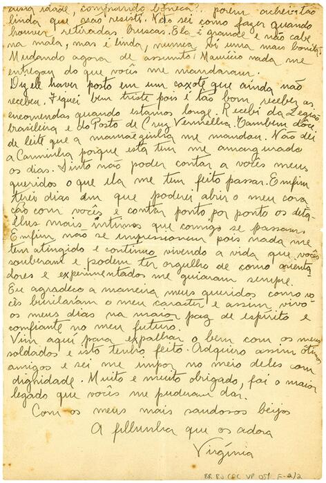 Nas Figuras 3 e 4 , tem-se uma correspondência da enfermeira Virgínia Portocarrero, que relata a seus familiares a rotina dos hospitais e dos cuidados aos pacientes feridos em conflito na Itália. Em geral, suas cartas abordam aspectos da rotina dos hospitais, dos cuidados e tecnologias em saúde utilizadas, seus sentimentos e percepções sobre os sofrimentos enfrentados durante o conflito e, nas entrelinhas, as marcas das formas de dominação masculina no campo militar.