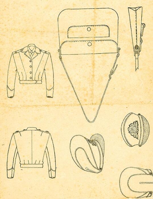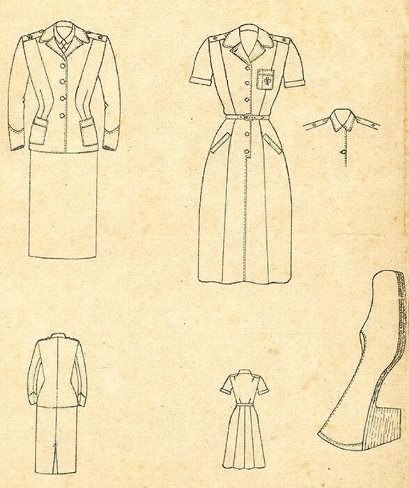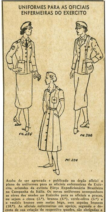As Figuras 7 a 9 mostram dois croquis e um recorte de jornal, que tratam do processo de criação do uniforme das enfermeiras da FEB em sua reinclusão ao Serviço Militar Ativo do Exército, em 1957 ( Oliveira, 2010 ). Vale ressaltar que, em 2018, essas imagens foram referência para auxiliar no processo de materialização do uniforme histórico feminino feito pelo Hospital Central do Exército, utilizado por enfermeiras do EB, como forma de homenagear a enfermeira veterana Virgínia Portocarrero, durante o evento que marcou as comemorações de seu centenário de vida.