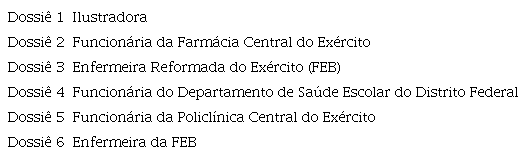 OLIVEIRA , Alexandre Barbosa de . Enfermeiras da Força Expedicionária Brasileira no front do pós-guerra: o processo de reinclusão no Serviço Militar Ativo do Exército (1945-1957) . Tese (Doutorado em Enfermagem) – Universidade Federal do Rio de Janeiro , Rio de Janeiro , 2010 .