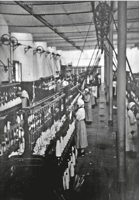Por último, el expediente presenta fotografías de la fábrica realizadas por Juan de Beraza. Aunque la calidad de las imágenes demuestra que los oficiales de la Secretaría de Industria, Comercio y Trabajo no fueron fotógrafos expertos, si permiten un acercamiento visual a las actividades de las obreras. Por ejemplo, es posible destacar dos elementos que resaltan a primera vista. En la Figura 1 se observa que las trabajadoras portan uniforme. Todas las mujeres usan blusas en color blanco y unas largas faldas negras. Esa característica sugiere la instauración de una disciplina rígida y la proscripción de determinadas costumbres, como la prohibición de apartarse de los espacios laborales y la creación de horarios fijos ( Rajchenberg, 1992 ). Los uniformes debían ayudar a los administradores de las empresas a identificar a las trabajadoras, ya que el color o los símbolos de la ropa indicaban el departamento al que pertenecían y, en cierto sentido, sus jornadas y el tipo de máquinas que utilizaban. Por otra parte, en la Figura 2 se puede apreciar que las mujeres que vigilaban los telares industriales cubrían sus cabezas con cofias de tela para evitar que las flechas, que movían las máquinas, las cogieran del cabello y les arrancaran la piel cabelluda, uno de los accidentes más traumáticos y recurrentes entre las obreras de las fábricas de productos textiles ( Palomo, 1937 ). La unidad de los apartados descritos (visuales y escritos) en el expediente del oficial Juan de Beraza remarcan la importancia que la higiene industrial adquirió en la vigilancia e inspección de las empresas mexicanas con el fin de asegurar la salud de las obreras, así como evitar el aumento de accidentes relacionados con el trabajo.
