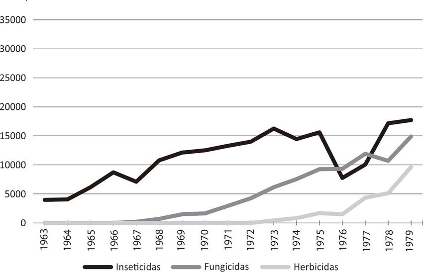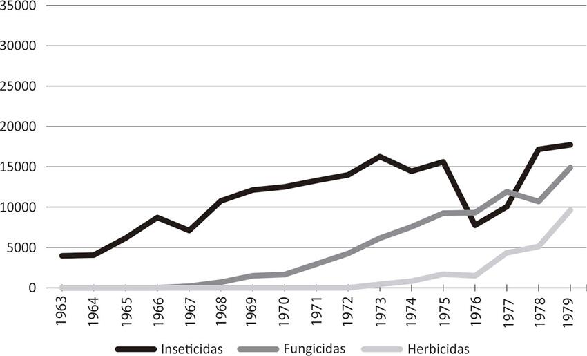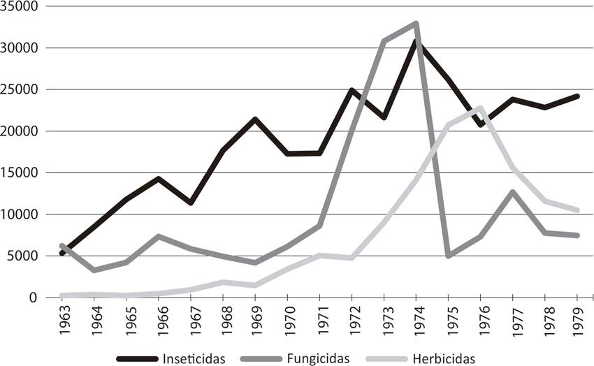 Gráfico da produção nacional de agrotóxicos (em toneladas) no Brasil, 1963-1979 (Fonte: Elaborado pelos autores com dados de Alves [1973] e Galvão [1979])