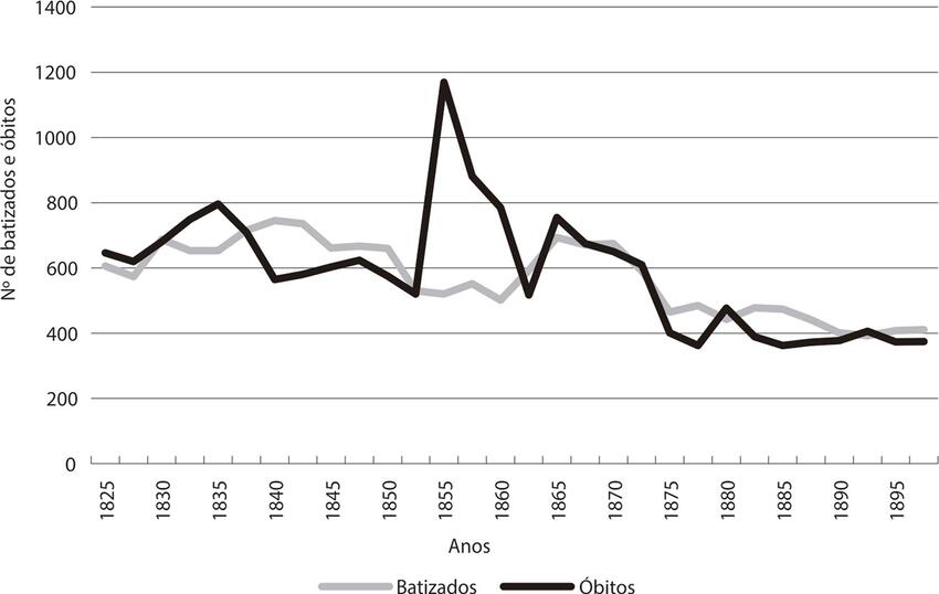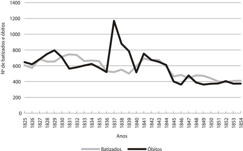 Gráfico do movimento de batizados e óbitos entre população total, 1825-1854 (Fonte: Arquivo Histórico da Cúria Metropolitana de Porto Alegre, Assentos de batizados e óbitos tabulados com o Nacaob, extração em janeiro de 2018)