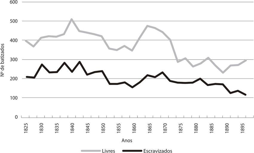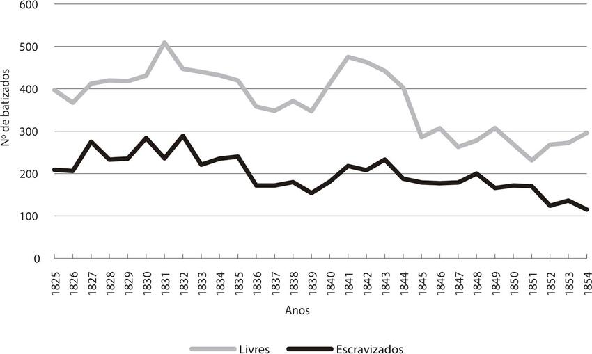 Gráfico do movimento anual de batizados por condição jurídica, Madre de Deus de Porto Alegre, 1825-1854 (Fonte: Arquivo Histórico da Cúria Metropolitana de Porto Alegre, Assentos de batizados tabulados com o Nacaob, extração em janeiro de 2018)