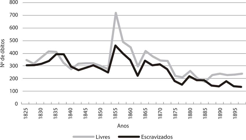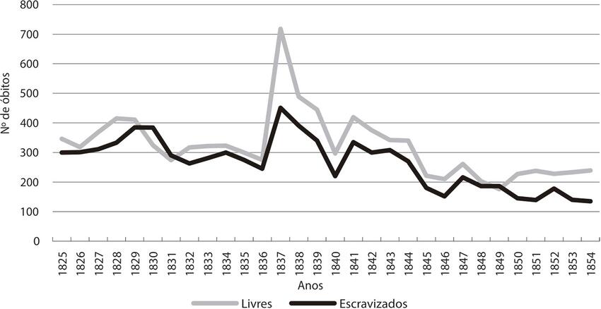 Gráfico do movimento anual de óbitos por condição jurídica, Madre de Deus de Porto Alegre, 1825-1854 (Fonte: Arquivo Histórico da Cúria Metropolitana de Porto Alegre, Assentos de óbitos tabulados com o Nacaob, extração em janeiro de 2018)