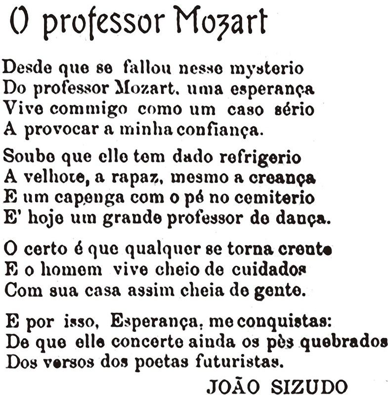 O caso do Professor Mozart, porém, distancia-se da literatura sobre o espiritismo no Brasil, pelo menos em parte. Ele é intrigante não por aspectos institucionais ou por uma prática singular que tenha inventado a partir de tais ou quais alicerces. É verdade que ele foi assistido por muitos grupos e instituições espíritas, e seus interesses e trajetória poderiam ser alvo de reflexão, mas não é sobre isso que este estudo procura atentar. Mozart foi um indivíduo que atravessou o Brasil para curar doentes, atraiu a atenção de autoridades e da população em geral. Naqueles anos de 1920, o impacto de sua presença foi tão curioso, que para melhor visualizá-lo é preciso incluir a variedade dos registros que foram produzidos na cultura brasileira durante aquela década em que seu nome circulou dos debates científicos às modinhas populares.