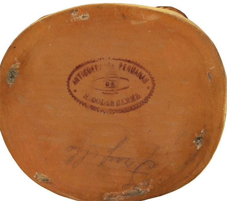 De todos ellos, la mayoría procede de la costa norte del Perú y puede ser atribuida a las culturas Moche y Chimú, aunque también hay artefactos Inca, Chancay, Tiwanaku, entre otros. Sobre la procedencia de la colección, la mayor parte de las piezas no indican el lugar de obtención; sin embargo, de los lugares con registro se mencionan las localidades de Trujillo y Chimbote como las más recurrentes. En menor medida se mencionan las localidades de Santa, Piura, Ancón, Tacna, Cuzco, Pisco, Lambayeque, Puno, Casma, Nepeña, Lurín, Lima etc. A pesar del diverso origen de dicha colección tanto en temporalidad como en geografía, la colección fue titulada como de “antigüedades incaicas” al momento de su adquisición, en concordancia con las ideas de la época. Esta situación es similar a la colección de José Mariano Macedo, la cual a pesar de ser denominada como incaica, sólo un 5% del total podría ser catalogado como Inca ( Gänger, 2018). Como signo de autenticidad y garantía, gran parte de las vasijas cerámicas de la colección presentaban un sello timbrado en su base con tinta azul, el cual dice “Antigüedades peruanas de Nicolás Sáenz” ( Figura 2 ), como forma de asegurar su propiedad y autenticidad bajo la reputación de su dueño. Sin embargo, al parecer Nicolás Sáenz no habría participado directamente en la obtención de los objetos de su colección, ya que cuando fue consultado en Chile por la comisión de expertos que recomendó su compra si alguno de los objetos fue excavado directamente por él desde “huacas”, Sáenz respondió “ninguno, todos han sido comprados” (Informe…, 10 ene. 1896). Así podemos ver que Sáenz debió haber tenido contacto con diversos intermediarios que le vendieron colecciones principalmente desde la costa norte del Perú. Por otra parte, la posesión de la colección en su casa que también funcionaba como liceo, sugiere que Sáenz le pudo haber dado un uso pedagógico con sus estudiantes.
