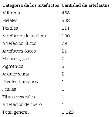 En cuanto a la colección de Nicolás Sáenz ( Figura 1 ), esta se compone de alrededor de 1.123 artefactos, en donde la alfarería representa un 43,5% del total general, seguido por un 27,4% de artefactos de metal, un 9,9% de textiles, un 8,9% de artefactos de madera, un 7% de artefactos líticos, entre otros representados en porcentajes menores: