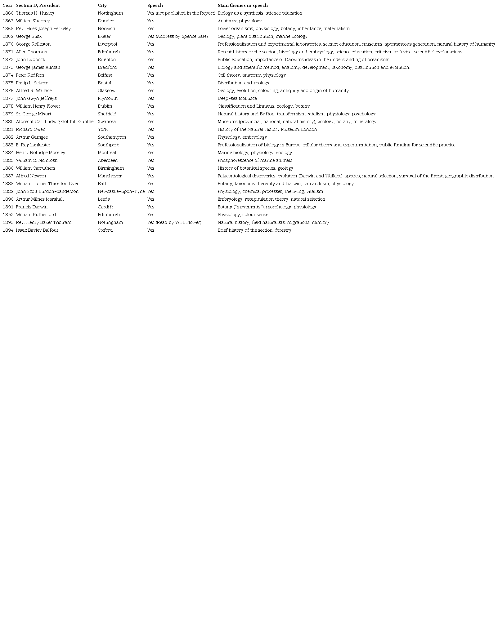 Regarding the addresses, there are some points to note. Traditionally, they were conceived as an introduction to the most significant achievements in biological issues over the preceding year. However, some issues were given higher priority, depending on the president’s background. For example, in the early years and as part of the agenda to increase professionalisation – and visibility – promoted by Huxley and the X-Club, one of the most frequently addressed issues was education, not only of in general science, but more specifically of biology.