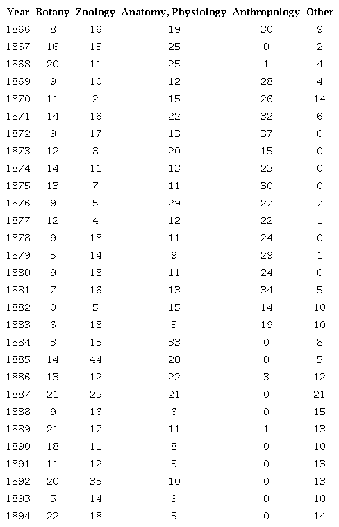 As for what is referred to here as “Other,” this category includes work that did not fit entirely into any of the other categories, mainly because it presented methodologies or approaches that differed from natural history or anatomy and physiology in the traditional sense. It is striking that the largest number of “different” submissions before the mid-1880s was when Huxley himself was president of BAAS in 1870. Moreover, although there may be thought to have been a “balance” in the number of presentations at each meeting from 1886 onwards, the topics concentrated on the new theoretical trends that emerged towards the end of the century: the role of museums in popularising science, heredity, micro-organism studies, embryology, cell theory, marine biology, mathematical approaches to biology, pharmacology, physico-chemistry, fisheries and economics, mycology, and critiques of Darwinism.