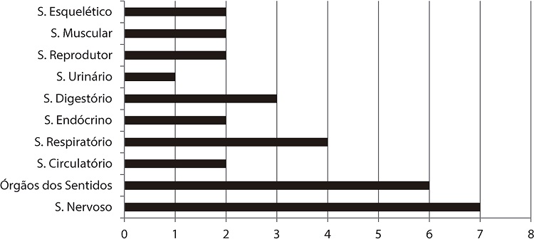O sistema muscular está representado, quase em sua totalidade, no modelo de corpo inteiro, que mostra em detalhes os músculos e tendões. Os músculos estão como peças destacáveis para visualização de estruturas profundas como vasos, nervos ou órgãos. O sistema circulatório foi identificado no modelo de coração e pulmões como peças isoladas, e também no modelo de corpo inteiro, onde vasos sanguíneos estão detalhadamente representados. O sistema esquelético está representado apenas por modelos da cabeça e pescoço, principalmente pelo crânio desarticulado de acordo com a técnica de Beauchêne. A Figura 2 mostra a frequência da representação sistêmica da coleção de modelos do presente estudo.