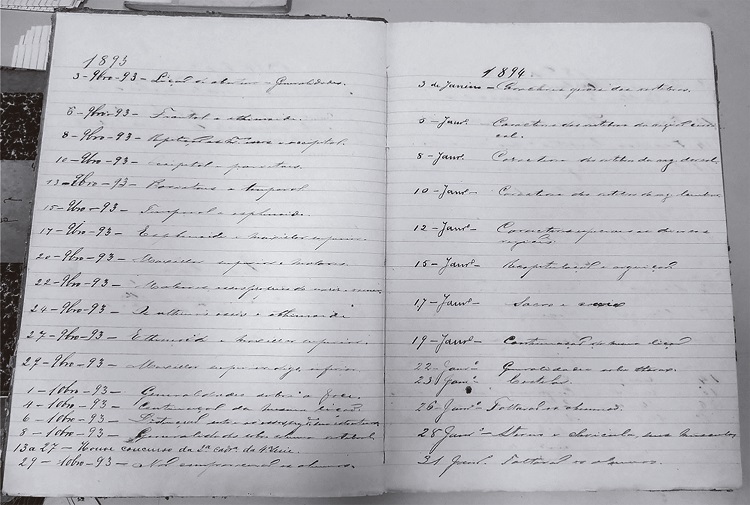 Um diário de classe, com os pontos de aulas, ditos como “lições” de anatomia humana ( Figura 4), retrata o conteúdo abordado, bem como a frequência semanal das aulas durante o final do século XIX e início do XX na Escola de Farmácia de Ouro Preto. No período em questão, os anos letivos eram contados de março a março. Nesse documento foi observado que os conteúdos mais abordados na anatomia foram: osteologia, principalmente da cabeça e coluna vertebral; sistema circulatório, especificamente o coração; tórax; músculos e ossos dos membros; sistema respiratório; vísceras abdominais (estômago, fígado, intestino delgado, intestino grosso, pâncreas) e sistema nervoso central. Apesar de o documento não descrever o local da aula nem categorizar aulas teóricas ou práticas, o diário mostra uma frequência de duas a três aulas semanais de anatomia. Observamos que houve mais cuidado e detalhamento nas anotações das aulas de anatomia dos anos iniciais (1893 e 1894).