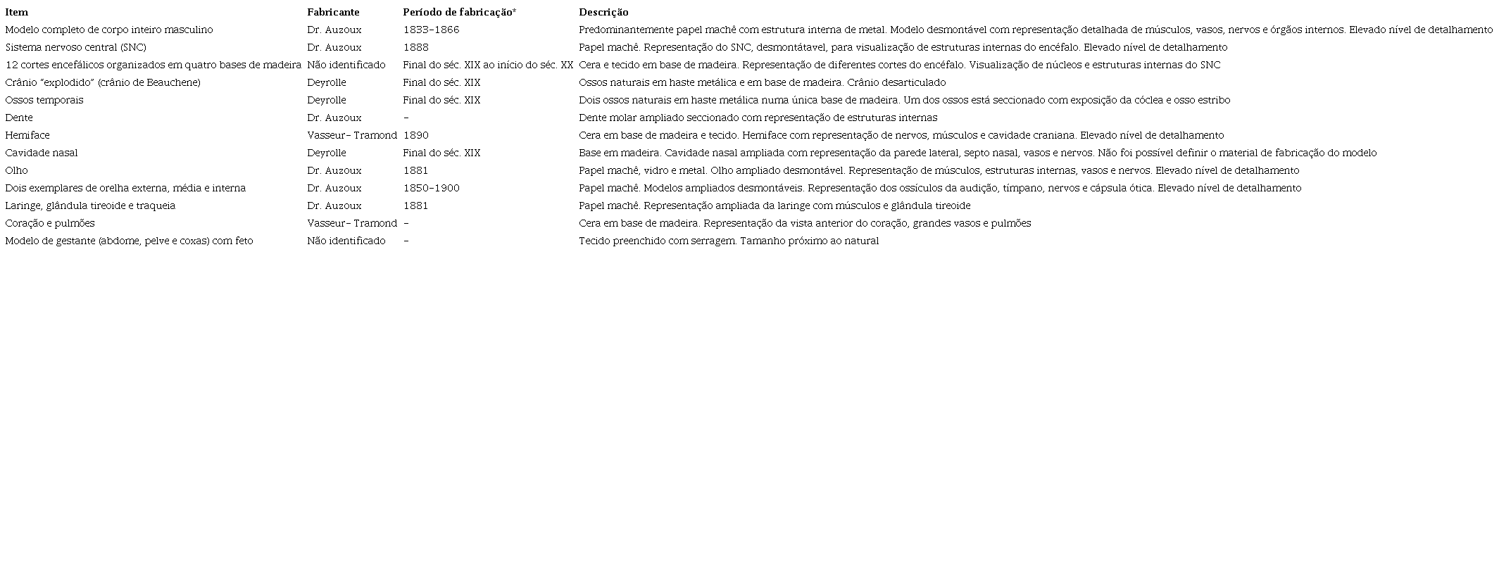 Foram identificados 17 modelos anatômicos históricos fabricados predominantemente em cera, papel machê, madeira e tecido ( Quadro 1). Os dados foram coletados nos próprios modelos, nos catálogos originais ( Auzoux, 1841) e em artigos científicos ( Valdecasas et al., 2009; Marković, Marković Zivković, 2010; Gomis, Ruiz-Berdún, 2016).