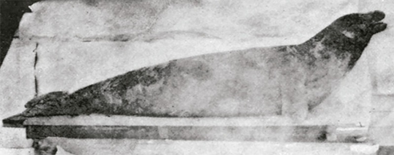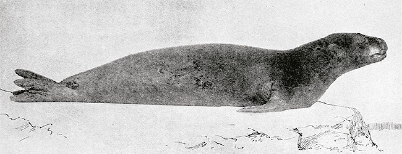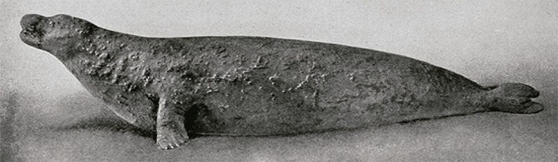 In 1884, author and artist Henry Elliott of the Smithsonian Natural History Museum published an article in Science with an illustration of Monachus tropicalis modeled on Poey’s prepared and mounted specimen. It is the first known drawing of the species (Figure 2). A photograph of the Poey specimen was reproduced in 1889 (Figure 3). Although he acknowledged that the monk seal was “excessively rare,” Elliott wrote in his Science article that he explicitly hoped the drawing would “stimulate the attention of some one of many fruit and sponge vessel owners now cruising in West-Indian waters, who, detecting the presence of another specimen, may secure it, and forward the rare and valuable trophy to those who would appreciate and preserve it” (Elliott, 1884, p.753). Elliott later became heavily involved in seal conservation, particularly in the North Pacific.