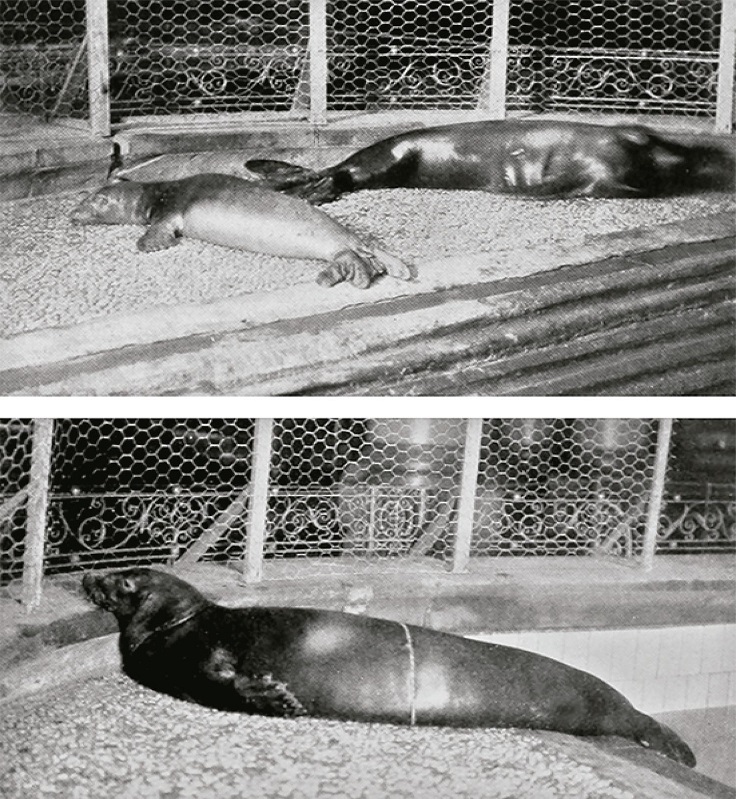 The New York Aquarium had slightly better success keeping the animals alive. This institution was founded in 1896 by the City of New York, and became part of the New York Zoological Society in 1902. Two monk seals captured in the Saunders 1897 expedition to The Triangles lived in the New York Aquarium; one of them survived five and a half years, 1897 to 1903, while the other lived just over two years (New York…, 1901; Townsend, 1904, 1906). The aquarium staff recognized that “considering the conditions under which seals have to be kept in the Aquarium and the limited space that can be allowed such active animals, the specimen lived about as long as could be expected” (New York…, 1901, p.83). Several years later, the aquarium once again had monk seals: one adult and three year-old individuals arrived on June 14, 1909, although one of the young ones died the day after arrival (Townsend, 1909). When another of the younger individuals died in April 1911, the body was given to the Harvard museum via the American Museum of Natural History (MCZ 8605). Two images of the adult, a young female, and a young male were published in 1910 in the Bulletin of the Zoological Society of New York, which the Society remarked “represent so far as we know the only ones in existence of the living animal” (New York…, 1910, p.644; Figure 8). The same image of the adult was reprinted in the aquarium’s picture book Inmates of the Aquarium (New York…, 1916, p.16).