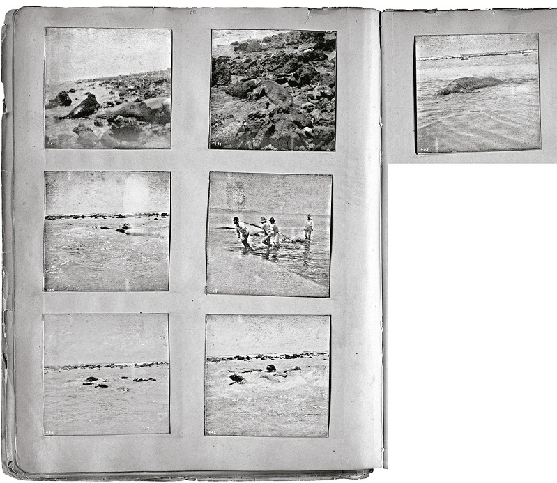 In spite of the claim by the Zoological Society of having the only photographs of live monk seals, there were actually some photographs of wild Caribbean monk seals taken during a museum collection hunt in 1900. Edward Alphonso Goldman and Edward William Nelson of the United States Fish and Wildlife Service took an expedition to the Triangle islands during June 18-23, 1900 to gather “specimens of the rare tropical seal Monachus tropicalis” and “in quest of these animals we were very successful” (Goldman, 1951, p.102). This was a defined scientific mission with the goal of bringing back substantial numbers of Caribbean monk seal specimens for the Smithsonian National Museum of Natural History collection. Nelson’s field notes from the expedition survive and have been transcribed by Adam and Garcia (2003). A photograph album in the Smithsonian collection (Smithsonian Institution Archives, RU 007364, Box 36, Folder 01-02) includes seven images taken during the Caribbean monk seal hunt as part of the expedition’s documentation. The photographs have faded, but show seals lying in shallow water on the beach at the transition between sand and rocks, and a group of seals swimming/wading with their heads above water (Figure 9). Nelson wrote that when killing seals in a group onshore, “the survivors always floundered into the water in a wild panic for some time swimming back and forth near shore raising their heads high out of water and watching us curiously as we were skinning their companions” (quoted in Adam, Garcia, 2003, p.302) The photographs of seals swimming apparently document this behavior. One image shows a team of four hunters dragging in a (dead) seal from the shallows. Just as Ward had done earlier, Nelson described the seals, which would lie “in a lethargic sleep,” as “very harmless creatures” behaving with “sluggish carelessness” and “stupidity” (quoted in Adam, Garcia, 2003, p.300-302). These ascribed personality traits likely made the party feel justified in its hunting tactics.