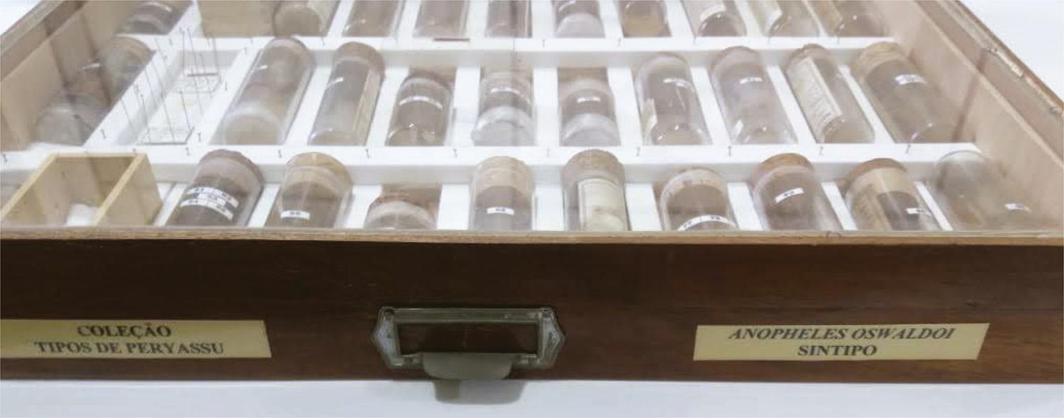 Um inventário da Coleção Peryassú, confeccionado entre 2011 e 2018, revelou que o acervo remanescente no MNRJ continha 722 mosquitos de 62 espécies, de 18 gêneros e 24 subgêneros de Culicidae, incluindo-se os tipos da espécie Cellia oswaldoi (= Anopheles oswaldoi ) descrita por Peryassú, em 1922 (Silva-do-Nascimento, Motta, Lourenço-de-Oliveira, 2020). Os mosquitos procederam majoritariamente do então Distrito Federal (cidade do Rio de Janeiro) e do estado do Rio de Janeiro, como revelam o referido inventário e relatório das atividades do museu ( Brasil, 1920 , p.39). A coleção continha mosquitos de localidades fluminenses como Xerém, Magé, Petrópolis, Porto das Caixas, Itatiaia e Angra dos Reis, e dos estados de Pernambuco, Pará, Bahia, Minas Gerais, Espírito Santo, São Paulo, Paraná, Santa Catarina e Rio Grande do Sul. Todo o material foi coletado no Brasil, exceto por um grupo de 19 exemplares de dez espécies capturados no Japão, entre 1915 e 1919. Como veremos a seguir, tais exemplares exóticos à fauna brasileira referem-se à permuta de mosquitos identificados pelo culicidologista japonês Shinichiro Yamada (1883-1937), que descreveu duas dezenas de espécies novas de mosquitos, entre 1917 e 1932 (Kurihara, Kurahashi, Shinohara, 2001).